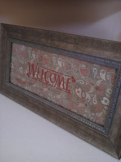 This morning I decided that I needed something to hang above our front door. The empty space has been nagging at me for awhile now. I found some old vinyl that I bought over two years ago and decided it would look great on a yard sale frame.